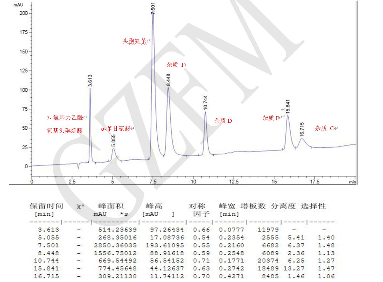 案例說(shuō)明:7-氨基去乙酰氧基頭孢烷酸峰與ɑ-苯甘氨酸峰之間的分離度應(yīng)符合要求;系統(tǒng)適用性溶液色譜 圖中,頭孢氨芐峰與相鄰雜質(zhì)峰之間的分離度應(yīng)符合要求。