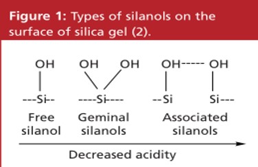 殘余的硅羥基存在于所有的硅膠鍵合相的表面。由于是弱酸的特性,這些硅羥基會(huì)同某些分析物相互作用,尤其是同一些堿性化合物。因?yàn)楣枇u基的Pka值大約是在4.5左右。