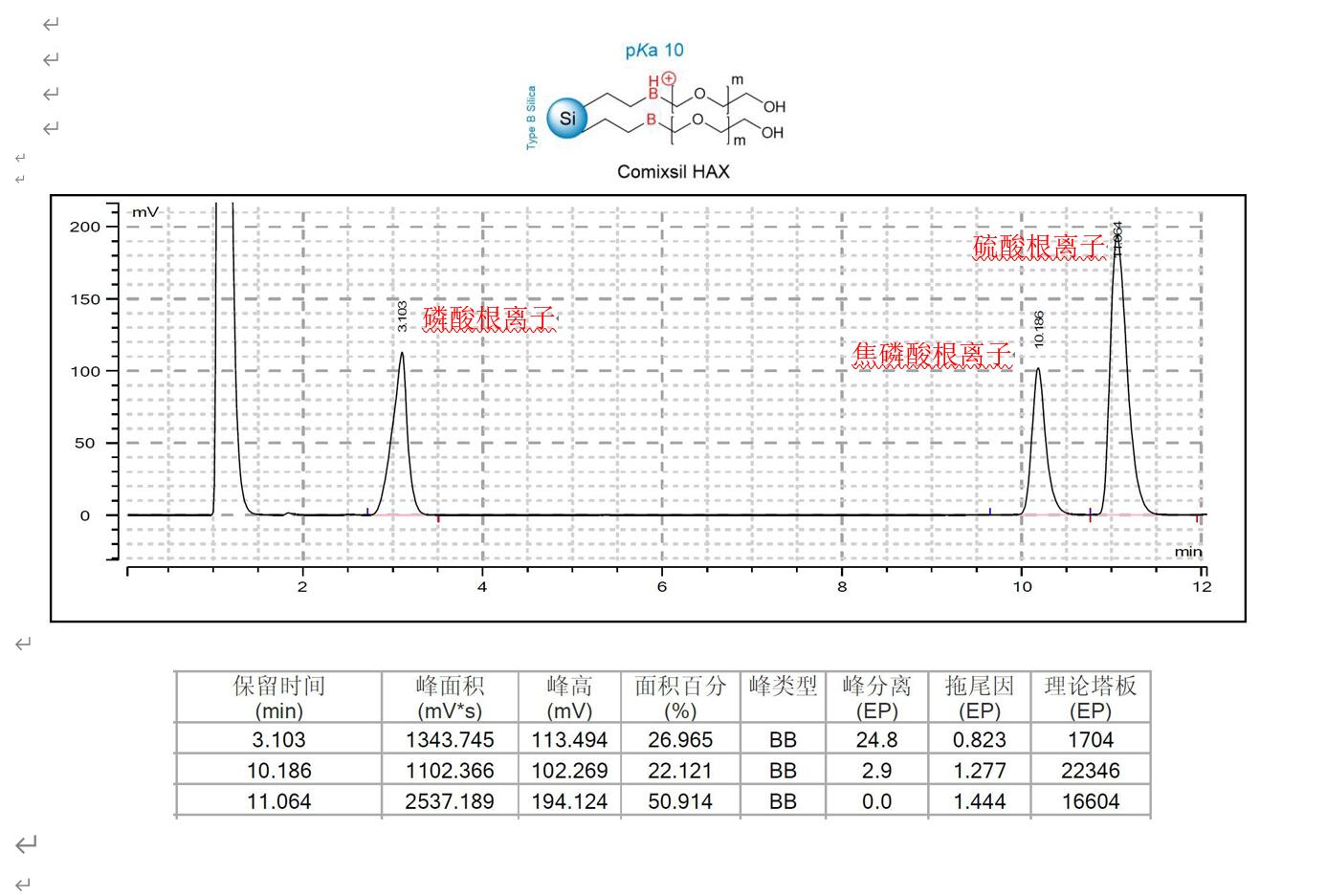 方法說明:通過 Comixsil HAX 的中等強度的陰離子交換能力保留各陰離子,通過酸的濃度調節各陰離子的保留,解決了在其他固定相上比較難解決的焦磷酸根離子的保留和峰形問題。Comixsil HAX 在高比例有機相條件下也存在強的 HILIC 作用,在本應用中,為了避免過強的保留,只發揮其陰離子交換的作用。