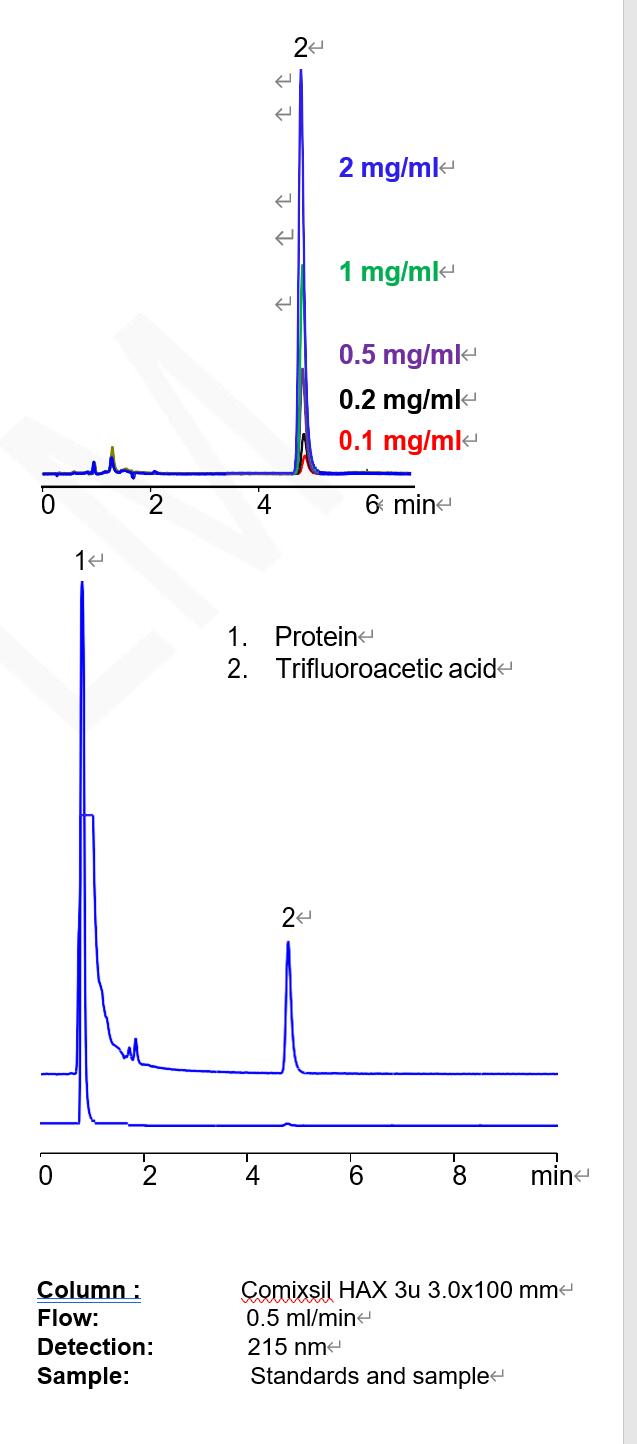 說(shuō)明:此方法同時(shí)適合多肽中TFA殘留量的測(cè)定。多肽的出峰時(shí)間將于蛋白相似或更早, 都不會(huì)干擾TFA的定量。此外,UV下的分析,也可采用Comixsil HAX 3u 100*4.6mm