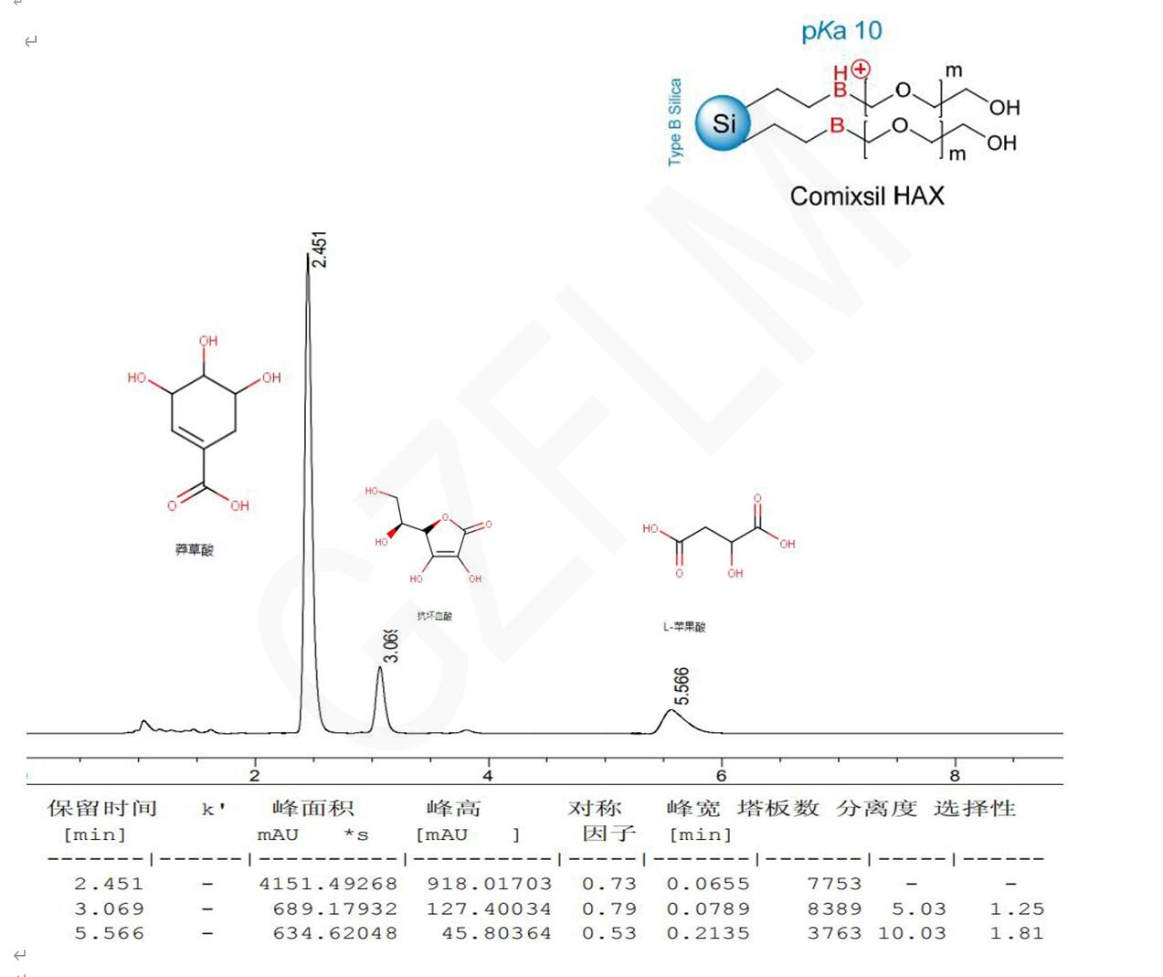 方法說(shuō)明:使用 Comixsil HAX 是陰離子交換+HILIC 混合模式,對(duì)莽草酸、抗壞血酸、蘋果酸三個(gè)有機(jī)酸進(jìn)行保留并分離,蘋果酸具有雙羧基結(jié)構(gòu),保留較強(qiáng)。