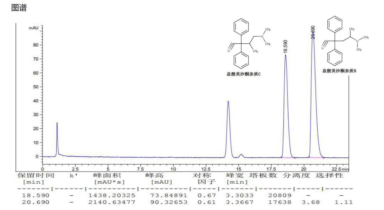 方法說(shuō)明:鹽酸美沙酮雜質(zhì) B、C 在結(jié)構(gòu)上屬于同分異構(gòu)體,酸性條件下拖尾嚴(yán)重且無(wú)法分離,使用耐堿性的 Titank C18,在堿性條件下可以將兩者分離,且峰型良好。