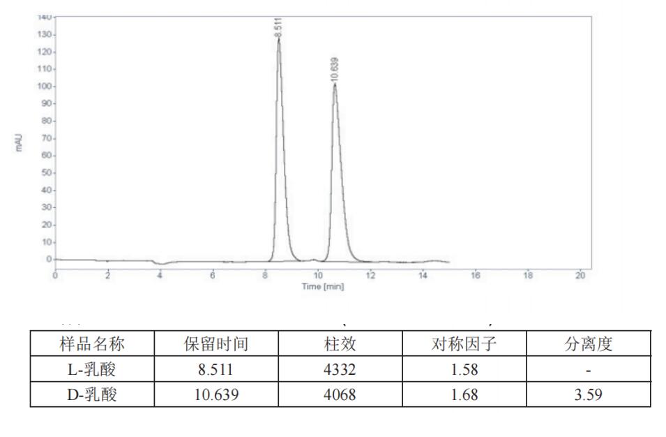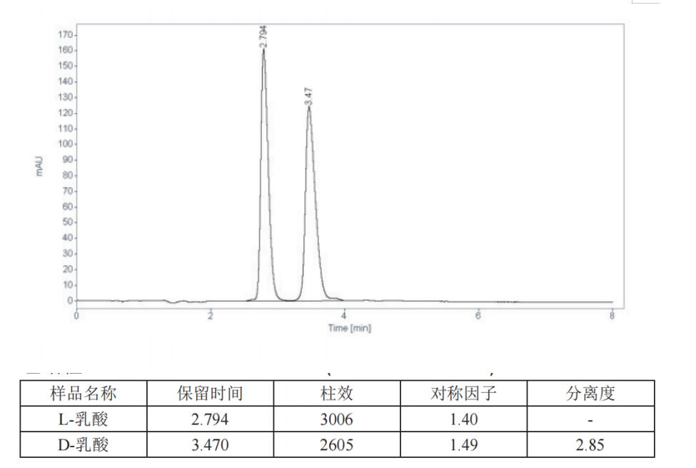 色譜柱2的方法也完全符合國家以下標準: A.GB1886.173-2016關于食品添加劑乳酸D,L異構體的檢測用柱要求 B.GB25555-2010 關于食品添加劑乳酸鈣的D,L異構體的檢測用柱要求