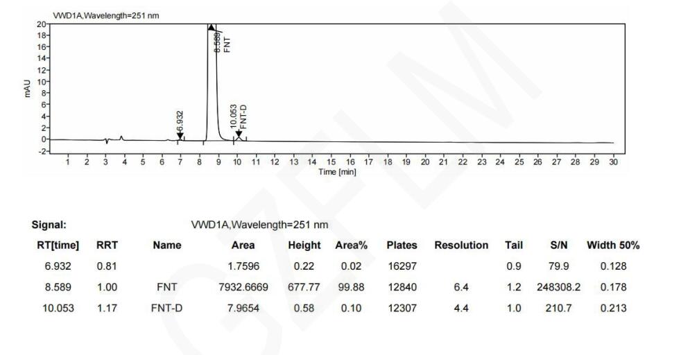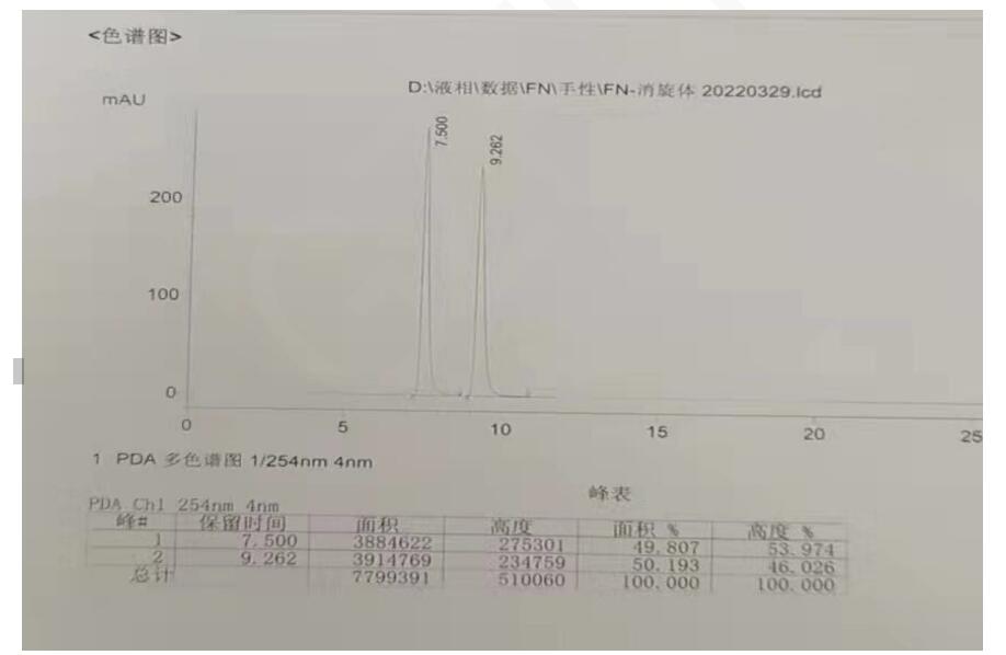 色譜柱 2:Chiral INC 3μm 250×4.6mm (FMG-JY3-I03) 流動相:反相(咨詢銷售代表) 流速:0.9 ml/min 進樣體積:10 μL 檢測波長:251nm 柱溫:30℃