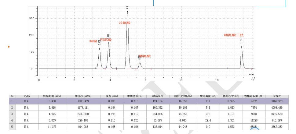 方法說明:本應(yīng)用參照 FLM-C190005《Comixsil HCS 柱分析 18 種非衍生氨基酸》,為洗脫保留較強(qiáng)的精氨酸三肽進(jìn)行了微調(diào)。各化合物峰之間分離度大,柱效優(yōu)秀。 |