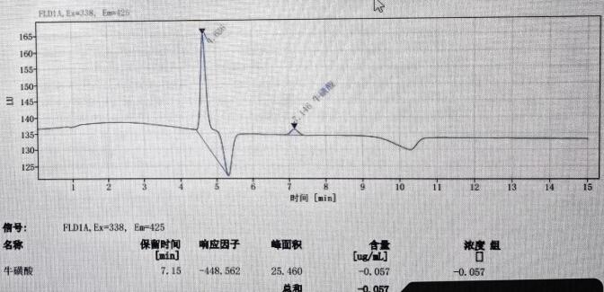 用牛磺酸標樣做重現性實驗,用 20ug/mL 濃度的標樣 6 針,其保留時間的相對標準偏差(RSD)是 0.062%, 峰面積的相對標準偏差(RSD)是 0.126%。