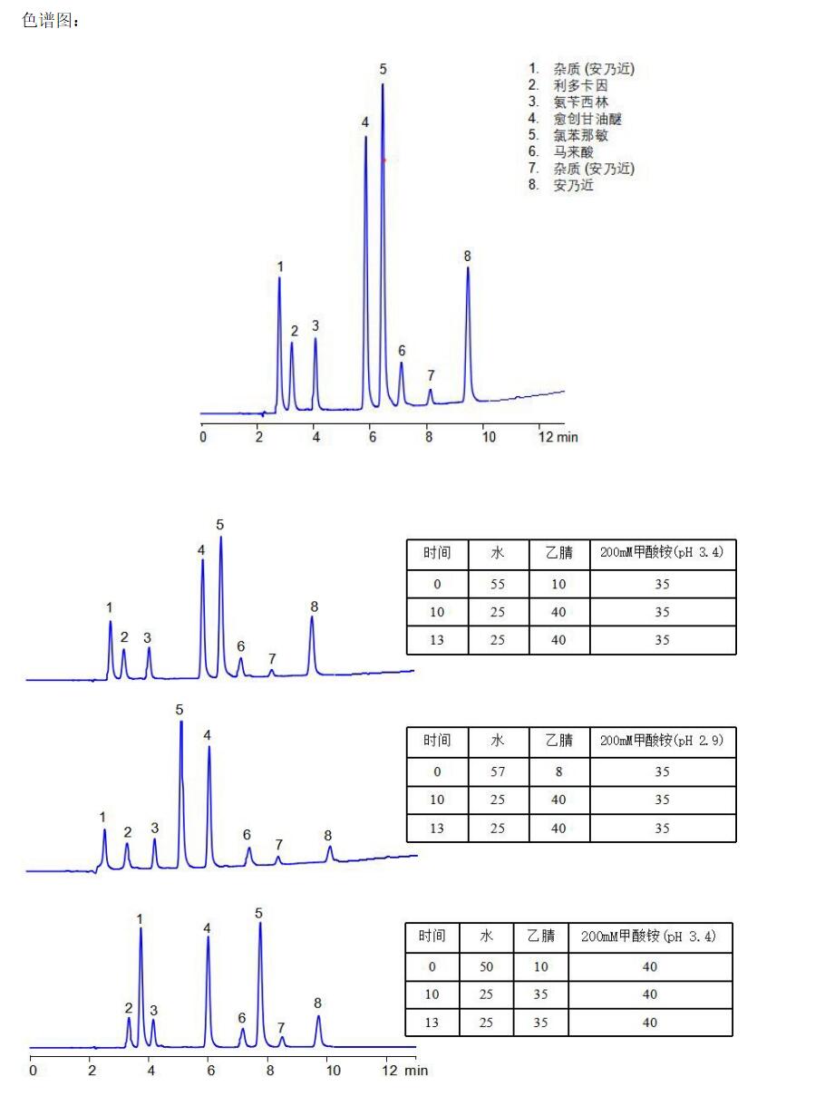 App ID: FLM-C240008 Comixsil RP-AX 同時分析鎮痛類藥物制劑安乃近、利多卡因、愈創甘油醚、馬來酸氯苯那敏、氨芐西林 色譜柱: Comixsil RP-AX 3μm 150*4.6mm(貨號:FMF-AXR3-EONU) 流動相: 時間 水 乙腈 200mM 甲酸銨(pH 3.4) 0 55 10 35 10 25 40 35 10.01 55 10 35 20 55 10 35 流速:1.0 mL/min 檢測波長:255nm 柱溫:25℃ 樣品濃度:N/A 進樣量:N/A 結構式: