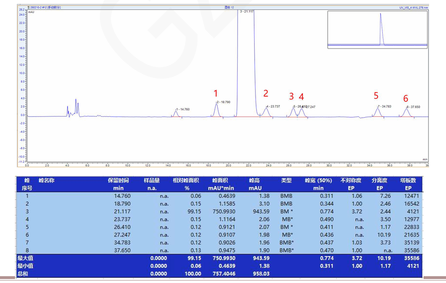 App ID: FLM-B250005 維生素K1 及其異構(gòu)體的手性拆分 色譜柱:Chiral NQ(2)-RH 3μm 250*4.6mm (貨號:FMG-AC3-A06-R) 流動相:咨詢 流速:0.8 mL/min 檢測波長:275nm 柱溫:25℃ 樣品濃度:N/A 稀釋劑:N/A 進(jìn)樣量:20ul 色譜圖: