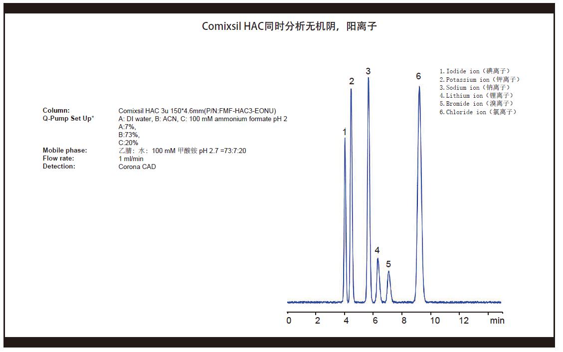 Comixsil HAC分離氨基糖苷類的鏈霉素與雙氫鏈霉素 Comixsil HAC分析8種氨基糖苷物質 Comixsil HAC分離11種核酸堿基與核苷(MS匹配) Comixsil HAC 液相方法分離鈣與鋅離子 Comixsil HAC同時分析鋅鈣銅等金屬離子及相應的陰離子
