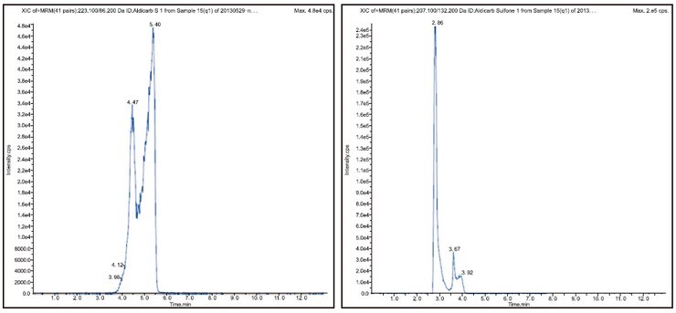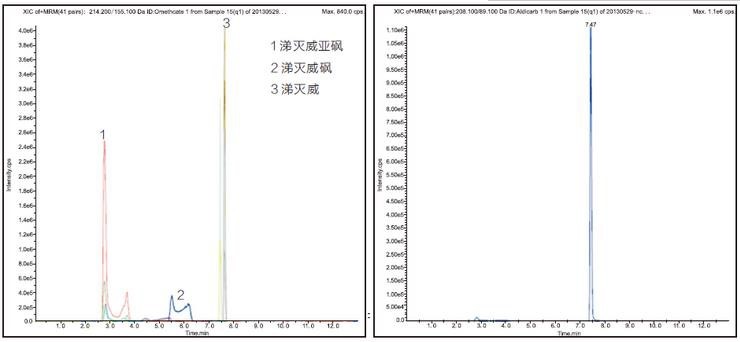 2、添加水平為 10 μg/kg 生姜基質中涕滅威及其代謝物檢測的色譜圖