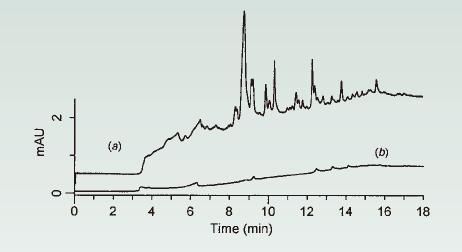 圖12. 運行空白梯度:(a)A容器受到污染的水(A容器中溶劑有雜質)和(b)A容器中純度較高的水。色譜柱:150x4.6mm C18;1.5mL/min;35℃;在255 nm處進行UV檢測。梯度:0-83%ACN /水運行13分鐘,并保持5分鐘。來源[7]。