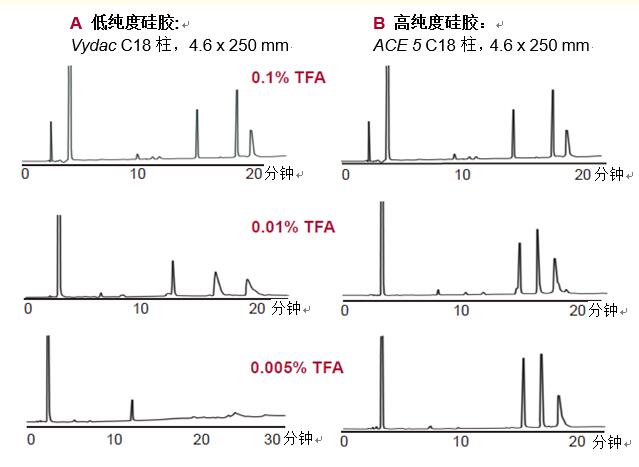 硅膠純度。高效液相色譜柱所用硅膠填料的純度對分離性能至關重要。金屬離子雜質(zhì)會導致峰拖尾和分辨率下降,如圖7A所示(0.01%和0.005%的TFA)。