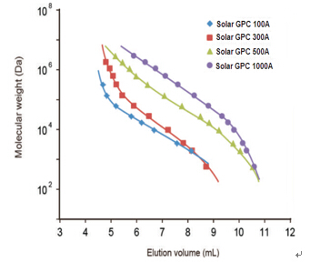 Solar系列體積排阻色譜柱,以高交聯(lián)度的聚苯乙烯/二乙烯苯(PS/DVB)顆粒為基質(zhì),具有極窄的粒徑和孔徑分布,使分析中保留時(shí)間與分子量具有準(zhǔn)確的線性關(guān)系。高交聯(lián)度的多孔顆粒具有優(yōu)異的化學(xué)和物理穩(wěn)定性,因此在更換有機(jī)溶劑時(shí)可以使分子量校正曲線的形狀和色譜柱的柱效幾乎保持不變。